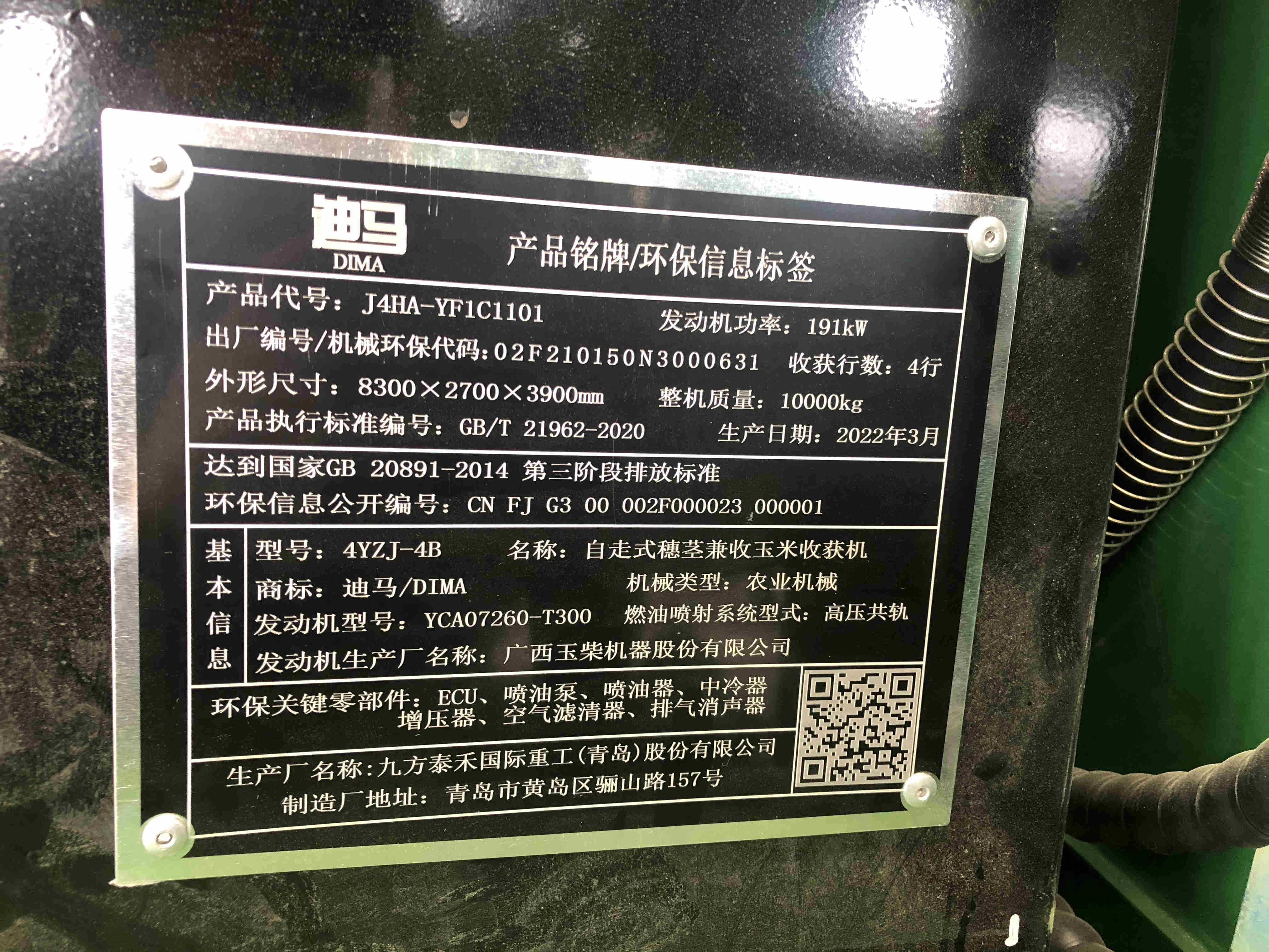 配套发动机型号规格:YCA07260-T300,配套发动机额定功率:191kW,配套发动机额定转速:2200r/min,配套发动机生产企业:广西玉柴机器股份有限公司,排放阶段:第三阶段。结构型式:轮式、摘穗、剥皮、秸秆还田、秸秆回收;整机外形尺寸(长×宽×高):8300*2700*3900mm;工作行数(通道数):4行;行距:600mm;工作幅宽:2400mm;果穗升运器布置位置:右置;果穗升运器结构型式:链条刮板式,摘穗机构型式:立辊式;剥皮机构型式:螺旋辊+鱼鳞辊;割台型式:立式;割刀型式:往复式;风扇型式:离心式;卸粮方式:液压翻转;秸秆粉碎还田机构型式:甩刀式;秸秆粉碎还田机构位置:中置;秸秆粉碎还田机构工作幅宽:2200mm;秸秆切碎回收机构型式:盘刀式;秸秆切碎回收机构位置:中置;秸秆切碎回收机构工作幅宽:φ900mm;驾驶室型式:普通式;变速机构型式:机械变速箱+静液压无级变速;驱动型式:两驱;驱动方式(前/后):前:液压驱动,后:无;制动器型式(前/后):前:盘式,后:无;轴距:3300mm;导向轮轮距:1860mm;驱动轮轮距:1860mm;导向轮轮胎规格:12.5/80-15.3;驱动轮轮胎规格:21L-24